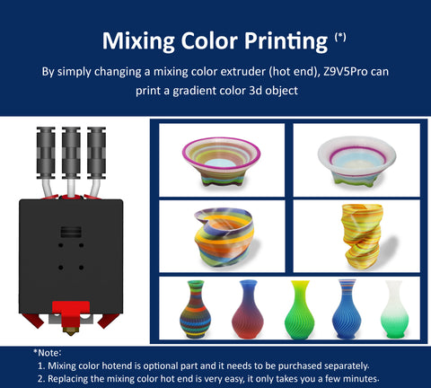 Z9V5PRO-MK4 padrão equipado com um hotend E4 ( 4-IN-1-OUT sem mistura de cores ), se você deseja imprimir o modelo 3D em cores gradientes, escolha o Opção Hotend Z9V5Pro-MK4 + M4V6.